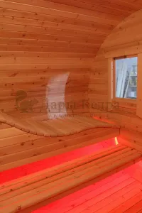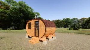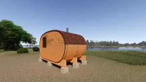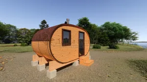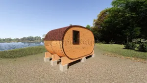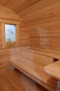 Овальная баня-бочка из кедра просторная и вместительная. Имеет два отделения: раздевалку, которую можно использовать как комнату отдыха, и парилку. Для удобства пользования раздевалка оснащена лавочкой, полкой и вешалкой из кедра. В парильном отделении располагается печь и двухуровневый открытый полок. Для установки такой модели не требуется полноценный фундамент, поэтому при необходимости ее можно перенести на другое место. Так же баню-бочку можно укомплектовать верандой со скамейками, козырьком и печью с внешней загрузкой, благодаря которой весь мусор после топки останется на улице.