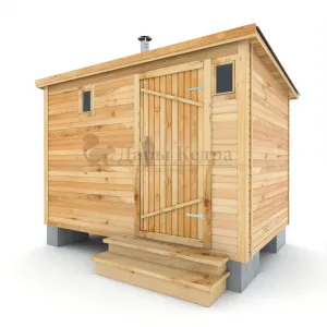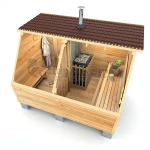 Это классическая прямоугольная модель бани с двумя отделениями: парилкой и раздевалкой. Для удобства пользования раздевалка оснащена лавочкой и вешалкой. Парилка оборудована двухуровневым открытым полком и печью. За счет небольшой конструкции баня нагревается в течении 30 минут. Ее можно заказать как в готовом, так и в разборном варианте. В разборной модели готовые щиты из кедра быстро собираются в полноценное строение, что также позволяет исключить лишний строительный мусор. Каркасно-щитовая баня не требует полноценный фундамент, поэтому при необходимости ее можно перенести в другое место.