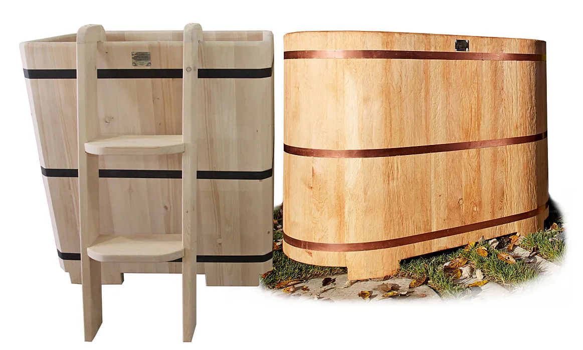 Двойная купель из кедра чаще всего используется в крупных банных комплексах и оздоровительных центрах. Она представляет собой две круглые чаши для воды, в которых люди отдыхают после парения. Между купелями установлен широкий подиум из кедра, по которому могут спускаться и подниматься сразу несколько людей. Для комфортного отдыха купель оснащена лавочками и двумя дополнительными лестницами. За счет стяжных болтов обручи из нержавеющей стали плотно прилегают к кедровой купели. Это позволяет равномерно распределять нагрузку воды и сохранить форму изделия в период эксплуатации. При правильном уходе купель для бани не рассыхается и не подвергается гниению.