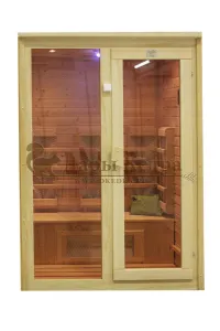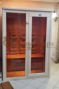 Это специально оборудованная кедровая кабина для прогрева тела человека сухим теплом. Воздух в таких парных не нагревается. Инфракрасные лучи воздействуют на тело, равномерно прогревая мышцы, суставы и органы. Керамические излучатели похожи на лампы, имеют высокую температуру нагрева, поэтому защищены противоожоговыми решетками. Тело человека в таких саунах нагревается интенсивнее. Работает кабина за счет электричества. Двухместная инфракрасная сауна с керамическими излучателями подойдет как для домашнего использования, так и для коммерции.