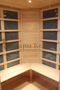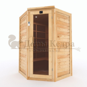 Это специально оборудованная кедровая кабина для прогрева тела человека сухим теплом. Воздух в таких парных не нагревается. Инфракрасные лучи воздействуют на тело, равномерно прогревая мышцы, суставы и органы. Карбоновые излучатели, встроенные в стены кабины, обладают мягким прогревом, что полностью исключает возможность ожога. Работает кабина за счет электричества. Установка сауны в угол, позволяет рационально использовать пространство помещения. Подходит как для домашнего использования, так и для коммерции.