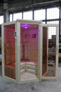 Это специально оборудованная кедровая кабина для прогрева тела человека сухим теплом. Воздух в таких парных не нагревается. Инфракрасные лучи воздействуют на тело, равномерно прогревая мышцы, суставы и органы. Керамические излучатели похожи на лампы, имеют высокую температуру нагрева, поэтому защищены противоожоговыми решетками. Тело человека в таких саунах нагревается интенсивнее. Работает кабина за счет электричества. Установка сауны в угол, позволяет рационально использовать пространство помещения. Подходит как для домашнего использования, так и для коммерции.