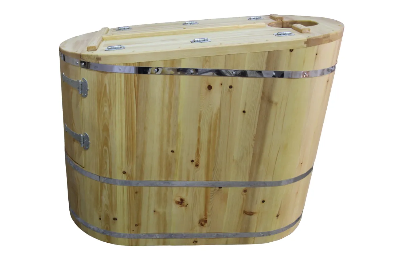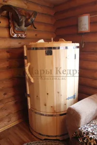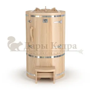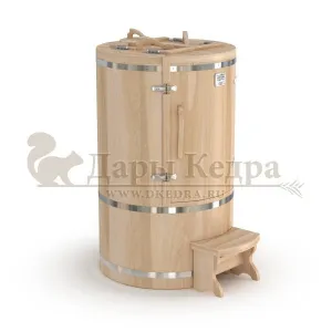 Круглая фитобочка из кедра - это мини парная, которую можно использовать не только в спа-салонах, но и дома. Такая модель наиболее компактна и мобильна. Толщина стенок составляет 25 мм. Фитобочка оборудована откидными створками, дверцей и отверстием для головы. Во время парения человек сидит внутри кедровой бочки, а голова находится снаружи. Благодаря этому исключается возможность перегрева. Подлокотники из кедра, встроенные ручки на створках и двери делают эксплуатацию более удобной.