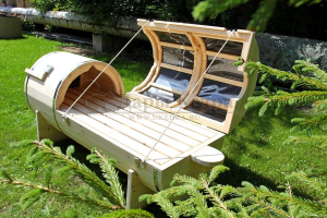 Горизонтальная двухрежимная фитобочка из кедра может быть использована как инфракрасная сауна и парная. Карбоновые излучатели отвечают за сухое парение и находятся на внутренней стороне дверцы. Влажное парение происходит за счет поступления горячего пара в фитобочку через паропровод. Горизонтальная форма позволяет принимать процедуры лежа. Внутренняя ручка из кедра облегчает открывание и закрывание двери во время парения. Такая модель наиболее удобна для оздоровительных центров.