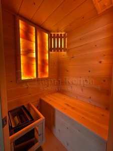 Это специально оборудованная деревянная кабина для сухого и влажного парения. Электропечь нагревает пространство внутри и позволяет сбрызгивать камни водой, слегка увлажняя воздух. Такая процедура позволяет избежать перегрева. Сауна обшита снаружи и внутри вагонкой из липы и имеет теплоизоляционный слой. Установка сауны в угол позволяет рационально использовать пространство помещения. Финская сауна с электропечью подойдет как для домашнего использования, так и для коммерции. Доставляется в разборном виде щитами, собирается по инструкции с помощью шуруповёрта.