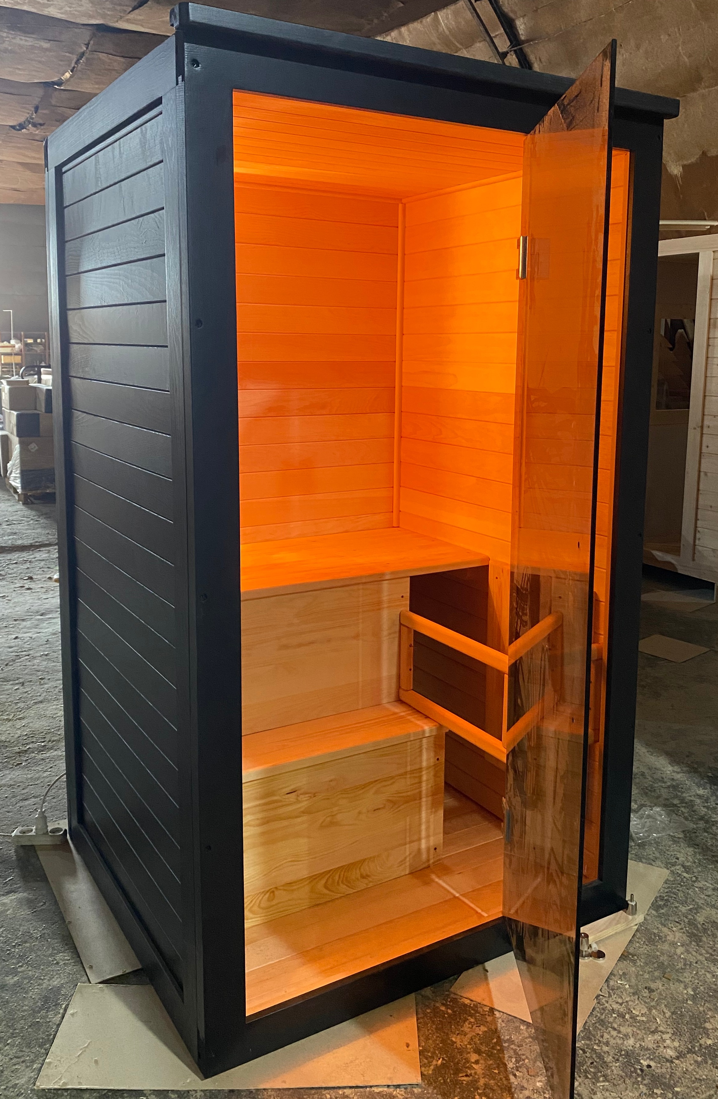 Это специально оборудованная деревянная кабина для сухого и влажного парения. Электропечь нагревает пространство внутри и позволяет сбрызгивать камни водой, слегка увлажняя воздух. Такая процедура позволяет избежать перегрева. Двойные стенки кабины с теплоизоляционным материалом удерживают тепло. Установка сауны в угол позволяет рационально использовать пространство помещения. Финская сауна с электропечью подойдет как для домашнего использования, так и для коммерции. Доставляется в разборном виде щитами, собирается по инструкции с помощью шуруповёрта.