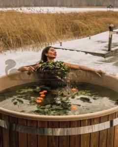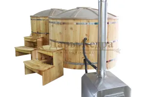 Это уличная подогреваемая купель с круглой внутренней чашей из термопластика, которая имеет цельную форму вместе с сиденьями и дном. Для удобства пользования купель фурако оборудована приставной лестницей. Подогрев воды осуществляется за счет внешней печи с дымоходом. Термопластик устойчив к воздействию температур, облегчает уход за фурако и увеличивает срок ее службы.